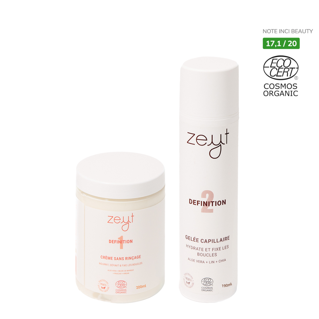 Formulées en laboratoire, notre Crème sans rinçage Bio - Définition n°1 - et notre Gelée Capillaire - Définition n°2 - nourrissent, définissent et fixent les boucles.